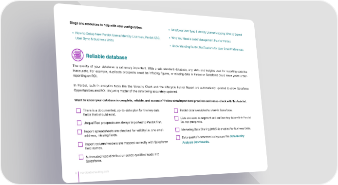 Blogs and resources to help with user configuration: • Salesforce User Sync & Identity License Mapping: What to Expect • How to Setup New Pardot Users: Identity Licenses, Pardot SSO, • Why You Need a Lead Management Plan for Pardot User Sync & Business Units • Understanding Pardot Notifications for User Email Preferences Reliable database The quality of your database is extremely important. With a sub-standard database, any stats and insights used for reporting could be inaccurate. For example, duplicate prospects could be inflating figures, or missing data in Pardot or Salesforce could mean you’re under- reporting on ROI. In Pardot, built-in analytics tools like the Velocity Chart and the Lifecycle Funnel Report are automatically updated to show Salesforce Opportunities and ROI. It’s just a matter of the data being accurately updated. Want to know your database is complete, reliable, and accurate? Follow data import best practices and sense-check with this task list: • There is a documented, up-to-date plan for the key data • Pardot data is enabled to show in Salesforce. fields that should exist. • Lists are used to segment and surface key data within Pardot • Unqualified prospects are always imported to Pardot first. i.e. top prospects. • Import spreadsheets are checked for validity i.e. one email • Marketing Data Sharing (MDS) is enabled for Business Units. address, missing fields. • Data quality is assessed using apps like Data Quality • Import column headers are mapped correctly with Salesforce Analysis Dashboards. field names. • Automated lead distribution sends qualified leads into Salesforce. 8 marcloudconsulting.com