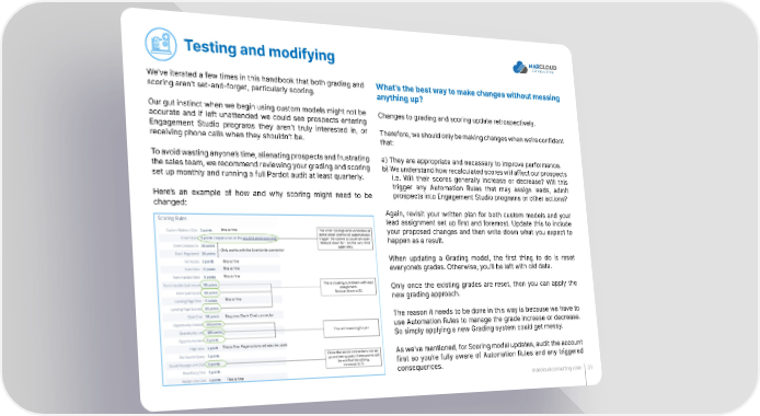 Testing and modifying We’ve iterated a few times in this handbook that both grading and What’s the best way to make changes without messing scoring aren’t set-and-forget, particularly scoring. anything up? Our gut instinct when we begin using custom models might not be Changes to grading and scoring update retrospectively. accurate and if left unattended we could see prospects entering Engagement Studio programs they aren’t truly interested in, or Therefore, we should only be making changes when we’re confident receiving phone calls when they shouldn’t be. that: To avoid wasting anyone’s time, alienating prospects and frustrating a) They are appropriate and necessary to improve performance. the sales team, we recommend reviewing your grading and scoring b) We understand how recalculated scores will affect our prospects set up monthly and running a full Pardot audit at least quarterly. i.e. Will their scores generally increase or decrease? Will this trigger any Automation Rules that may assign leads, admit Here’s an example of how and why scoring might need to be prospects into Engagement Studio programs or other actions? changed: Again, revisit your written plan for both custom models and your lead assignment set up first and foremost. Update this to include your proposed changes and then write down what you expect to happen as a result. When updating a Grading model, the first thing to do is reset everyone’s grades. Otherwise, you’ll be left with old data. Only once the existing grades are reset, then you can apply the new grading approach. The reason it needs to be done in this way is because we have to use Automation Rules to manage the grade increase or decrease. So simply applying a new Grading system could get messy. As we’ve mentioned, for Scoring model updates, audit the account first so you’re fully aware of Automation Rules and any triggered consequences. marcloudconsulting.com 25