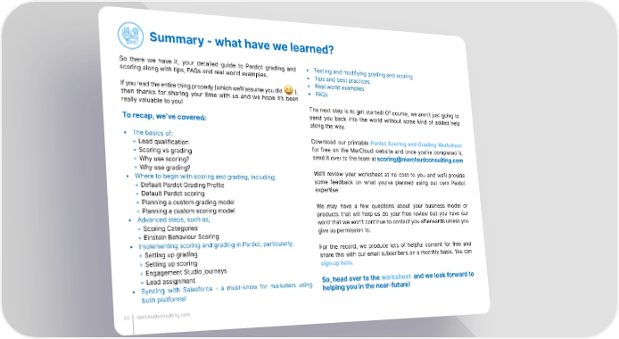 Summary - what have we learned? So there we have it, your detailed guide to Pardot grading and • Testing and modifying grading and scoring scoring along with tips, FAQs and real world examples. • Tips and best practices • Real world examples If you read the entire thing properly (which we’ll assume you did ), • FAQs then thanks for sharing your time with us and we hope it’s been really valuable to you! The next step is to get started! Of course, we aren’t just going to send you back into the world without some kind of added help To recap, we’ve covered: along the way. • The basics of: Download our printable Pardot Scoring and Grading Worksheet ◦ Lead qualification for free on the MarCloud website and once you’ve completed it, ◦ Scoring vs grading send it over to the team at ◦ Why use scoring? scoring@marcloudconsulting.com ◦ Why use grading? We’ll review your worksheet at no cost to you and we’ll provide • Where to begin with scoring and grading, including; some feedback on what you’ve planned using our own Pardot ◦ Default Pardot Grading Profile expertise. ◦ Default Pardot scoring ◦ Planning a custom grading model We may have a few questions about your business model or ◦ Planning a custom scoring model products that will help us do your free review but you have our • Advanced steps, such as; word that we won’t continue to contact you afterwards unless you ◦ Scoring Categories give us permission to. ◦ Einstein Behaviour Scoring • Implementing scoring and grading in Pardot, particularly; For the record, we produce lots of helpful content for free and ◦ Setting up grading share this with our email subscribers on a monthly basis. You can ◦ Setting up scoring sign up here. ◦ Engagement Studio journeys ◦ Lead assignment So, head over to the worksheet and we look forward to • Syncing with Salesforce - a must-know for marketers using helping you in the near-future! both platforms! 32 marcloudconsulting.com