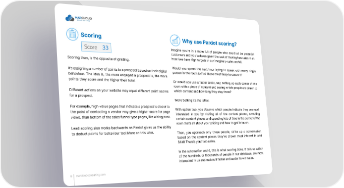 Scoring Why use Pardot scoring? Imagine you’re in a room full of people who could all be potential customers and you’ve been given the task of making two sales in an Scoring then, is the opposite of grading. hour (we have high targets in our imaginary sales world). It’s assigning a number of points to a prospect based on their digital Would you spend the next hour trying to speak with every single person in the room to find those most likely to convert? behaviour. The idea is, the more engaged a prospect is, the more points they score and the higher their total. Or would you use a faster tactic, say, setting up each corner of the room with a piece of content and seeing which people are drawn to Different actions on your website may equal different point scores which content and how long they stay there? for a prospect. We’re betting it’s the latter. For example, high-value pages that indicate a prospect is closer to With option two, you observe which people indicate they are most the point of contacting a vendor may give a higher score for page interested in you by visiting all of the content pieces, revisiting views, than bottom of the sales funnel type pages, like a blog post. certain content pieces and spending lots of time in the corner of the Lead scoring also works backwards as Pardot gives us the ability room that’s all about your pricing and how to get in touch. to deduct points for behaviour too! More on this later. Then, you approach only these people, strike up a conversation based on the content pieces they’ve shown most interest in and BAM! There’s your two sales. In the automation world, this is what scoring does. It tells us which of the hundreds or thousands of people in our database, are most interested in us and makes it faster and easier to win sales. 8 marcloudconsulting.com