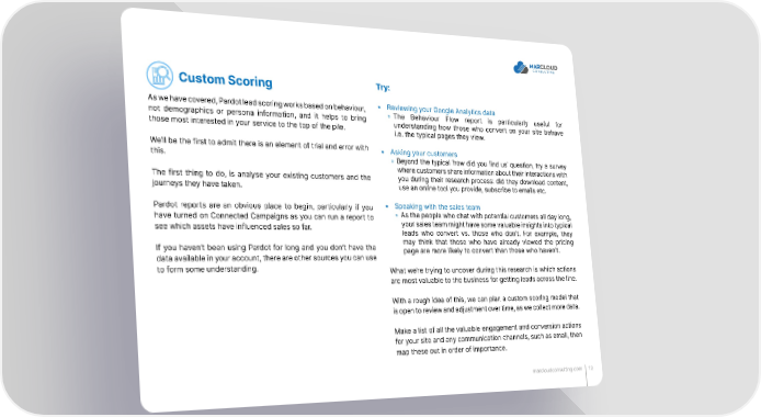 Custom Scoring Try: As we have covered, Pardot lead scoring works based on behaviour, • Reviewing your Google Analytics data not demographics or persona information, and it helps to bring ◦ The Behaviour Flow report is particularly useful for those most interested in your service to the top of the pile. understanding how those who convert on your site behave i.e. the typical pages they view. We’ll be the first to admit there is an element of trial and error with • Asking your customers this. ◦ Beyond the typical ‘how did you find us’ question, try a survey where customers share information about their interactions with The first thing to do, is analyse your existing customers and the you during their research process: did they download content, journeys they have taken. use an online tool you provide, subscribe to emails etc. Pardot reports are an obvious place to begin, particularly if you • Speaking with the sales team have turned on Connected Campaigns as you can run a report to ◦ As the people who chat with potential customers all day long, see which assets have influenced sales so far. your sales team might have some valuable insights into typical leads who convert vs. those who don’t. For example, they If you haven’t been using Pardot for long and you don’t have the may think that those who have already viewed the pricing data available in your account, there are other sources you can use page are more likely to convert than those who haven’t. to form some understanding. What we’re trying to uncover during this research is which actions are most valuable to the business for getting leads across the line. With a rough idea of this, we can plan a custom scoring model that is open to review and adjustment over time, as we collect more data. Make a list of all the valuable engagement and conversion actions for your site and any communication channels, such as email, then map these out in order of importance. marcloudconsulting.com 13