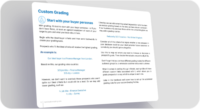 Custom Grading Start with your buyer personas Likewise, we can add something called ‘degradation’ which is when we reduce grading based on the data we have about a prospect. With grading, it’s best to start with your buyer personas - or if you If our business only services those within the United Kingdom we don’t have these, at least an agreed breakdown of each of your may add a grading rule for: target buyers and what you know about them. Reduce by 3/3 if location = Not United Kingdom Begin with the ideal buyer criteria and then work backwards to Consider all of the criteria that signal whether a new prospect in create your grading rules. your database could be your ideal potential future customer or Prospects who fit the ideal criteria will receive the highest grading. somebody you should ignore altogether. An example is: Use this to map out where you need to increase or decrease a prospect’s grade. Then choose the suitable amount to adjust by. Our ideal buyer is a Finance Manager from London. Don’t forget that you can have different grading models for different Based on this, our grading rules could be: audience groups i.e. a wholesale customer and a retail customer. 3/3 job title = Finance Manager When it comes to setting this up in Pardot, each profile will have 3/3 city = London different custom fields associated with it, which allows you to grade prospects in a way which is unique to each one. However, we don’t want to overlook those prospects who aren’t Later in this handbook we’ll cover how to set up the automated quite our ideal criteria but could still be a lead. So we may add grading rules for your custom Grading Profiles. lower grading, such as: ⅔ job title - Finance Executive ⅔ city = Surrey 12 marcloudconsulting.com