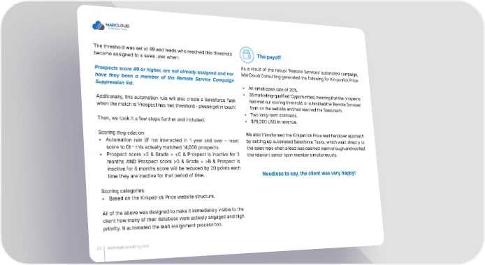 The threshold was set at 49 and leads who reached this threshold The payoff became assigned to a sales user when: As a result of the robust ‘Remote Services’ automated campaign, Prospects score 49 or higher, are not already assigned and nor MarCloud Consulting generated the following for Kirkpatrick Price: have they been a member of the Remote Service Campaign Suppression list. • An email open rate of 26%. • 36 marketing-qualified ‘Opportunities’, meaning that the prospects Additionally, this automation rule will also create a Salesforce Task had met our scoring threshold, or submitted the ‘Remote Services’ when the match is ‘Prospect has met threshold - please get in touch’. form on the website and had reached the Sales team. • Two long-term contracts. Then, we took it a few steps further and included: • $78,000 USD in revenue. Scoring degradation: We also transformed the Kirkpatrick Price lead handover approach • Automation rule (if not interacted in 1 year and over - reset by setting up automated Salesforce Tasks, which went directly to score to 0) - this actually matched 14,000 prospects. the sales reps when a lead was deemed warm enough and notified • Prospect score >0 & Grade = 0 & Grade = >B & Prospect is inactive for 6 months score will be reduced by 20 points each time they are inactive for that period of time. Needless to say, the client was very happy! Scoring categories: • Based on the Kirkpatrick Price website structure. All of the above was designed to make it immediately visible to the client how many of their database were actively engaged and high priority. It automated the lead assignment process too. 30 marcloudconsulting.com