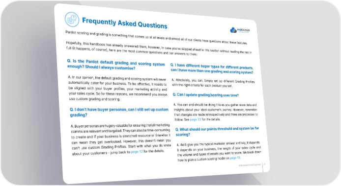 Frequently Asked Questions Pardot scoring and grading is something that comes up at all levels and almost all of our clients have questions about these features. Hopefully, this handbook has already answered them, however, in case you’ve skipped ahead to this section without reading the rest in full (it happens, of course), here are the most common questions and our answers to them: Q. Is the Pardot default grading and scoring system Q. I have different buyer types for different products, enough? Should I always customise? can I have more than one grading and scoring system? A. In our opinion, the default grading and scoring system will never A. Absolutely, you can. Simply set up different Grading Profiles automatically cater for your business. To be effective, it needs to with the right criteria for each product you sell. be aligned with your buyer profiles, your marketing activity and your sales cycle. So for these reasons, we recommend you always Q. Can I update grading/scoring over time? use custom grading and scoring. A. You can and should be doing this as you gather more data and Q. I don’t have buyer personas, can I still set up custom insights about your ideal customer’s journey. However, remember grading? that changes are made retrospectively and there are processes to follow. See page 25 for the details. A. Buyer personas are hugely valuable for ensuring that all marketing comms are relevant and targeted. They can also be time-consuming Q. What should our points threshold and system be for to create and if your business is stretched resource or timewise it scoring? can mean they get overlooked. However, this doesn’t mean you can’t use custom Grading Profiles. Start with what you do know A. We’ll give you the typical marketer answer and say, it depends. about your customers - jump back to page 12 for the details. It depends on your business, the length of your sales cycle and the volume and types of assets you want to score. We break down how to plan a custom scoring model on page 13. marcloudconsulting.com 31