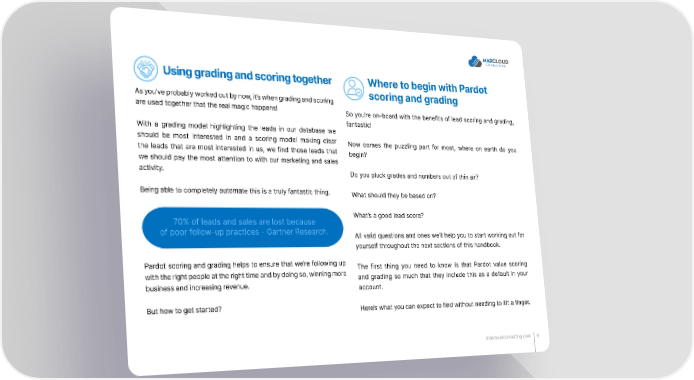 Using grading and scoring together Where to begin with Pardot As you’ve probably worked out by now, it’s when grading and scoring scoring and grading are used together that the real magic happens! So you’re on-board with the benefits of lead scoring and grading, fantastic! With a grading model highlighting the leads in our database we should be most interested in and a scoring model making clear Now comes the puzzling part for most, where on earth do you the leads that are most interested in us, we find those leads that begin? we should pay the most attention to with our marketing and sales activity. Do you pluck grades and numbers out of thin air? Being able to completely automate this is a truly fantastic thing. What should they be based on? 70% of leads and sales are lost because What’s a good lead score? of poor follow-up practices - Gartner Research. All valid questions and ones we’ll help you to start working out for yourself throughout the next sections of this handbook. Pardot scoring and grading helps to ensure that we’re following up The first thing you need to know is that Pardot value scoring with the right people at the right time and by doing so, winning more and grading so much that they include this as a default in your business and increasing revenue. account. But how to get started? Here’s what you can expect to find without needing to lift a finger. marcloudconsulting.com 9