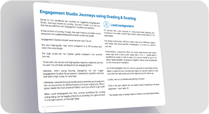 Engagement Studio Journeys using Grading & Scoring Earlier in this handbook we touched on triggering Engagement Studio Journeys based on scoring. You don’t need us to tell you Lead assignment that the possibilities with Engagement Studios are endless. Of course, the core purpose of using automated grading and In the context of scoring though, the main thing to consider is how scoring is to be able to send high-quality, sales-ready leads to the prospects are segmented based on their score and grade. sales team. Engagement Studios should never be one-size-fits-all. For many businesses, different sales reps cover different regions and some may have specific knowledge of a product or service Put your high-grade, high score prospects in a VIP journey and you sell. tailor this accordingly. Furthermore, a business often has more experienced and senior Put high score but not highest grade prospects into another sales reps and a more junior sales team. If an A+ grade lead is journey. qualified as ready to talk to sales, this person needs to go to the senior sales member, whereas a C grade or below may be assigned Those with low scores and high grades require a separate journey to the more junior members. too and this will likely be based on re-engaging them. All of this highlights that not only do we need to send high priority Likewise, when using Scoring Categories we can trigger leads to sales as soon as they are ready but we also need to make Engagement Studios for prospects interested in specific services sure that the right leads go to the right person for follow up. and with a high score, for example. Ultimately, consider how your grades and scores help you to segment Luckily, we can automate everything in Pardot! the nurture activity for different levels of interest and priority. Which group needs the most attention? Which can’t you afford to go cold? (This is the part where we can really impact marketing and sales alignment - don’t skip it!) When used strategically like this, nurture workflows for scoring and grading can be hugely effective at providing the right content, The easiest way to assign leads to Sales is via Automation Rules. to the right person, at the right time. 22 marcloudconsulting.com