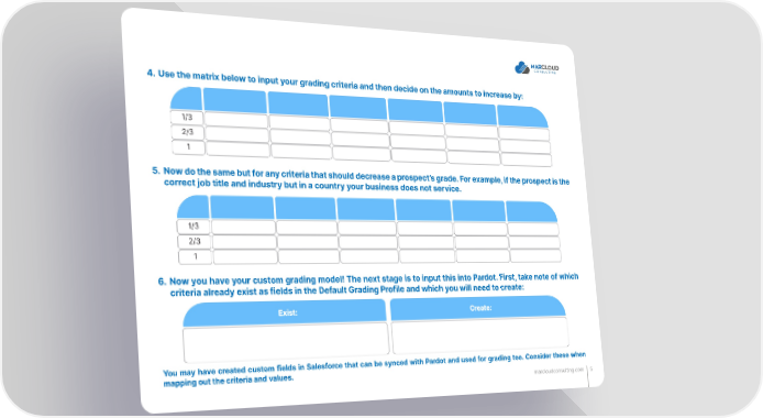 4. Use the matrix below to input your grading criteria and then decide on the amounts to increase by: 1/3 2/3 1 5. Now do the same but for any criteria that should decrease a prospect’s grade. For example, if the prospect is the correct job title and industry but in a country your business does not service. 1/3 2/3 1 6. Now you have your custom grading model! The next stage is to input this into Pardot. First, take note of which criteria already exist as fields in the Default Grading Profile and which you will need to create: You may have created custom fields in Salesforce that can be synced with Pardot and used for grading too. Consider these when mapping out the criteria and values. marcloudconsulting.com 5