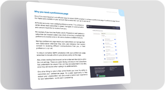 marcloudconsulting.com 20 Why you need a preferences page One of the most important and efficient ways to remain GDPR compliant is to have a preferences page. A preference page lists all the Public Lists available in your account that a subscriber can opt in and out of. All Pardot accounts have a default preference center. This preference center allows each subscriber to select the types of communication and content they’d like to receive from you. For example, if you have two Public Lists for ‘Promotions’ and ‘Updates’, a subscriber can choose to select one or both of the Lists, to indicate their preference to receive some or all communications available from you. Having a preferences page means your subscribers can manage their own subscription whenever they wish, and indicates their explicit consent in receiving different communications from you, or their preference to opt out. To ensure complete GDPR compliance with your preferences page, remember to include a link to your privacy policy on the page. Also, when creating Lists be sure to enter a label and description within the List settings. These are public facing and ensure that subscribers fully understand the value of the List they are subscribed to but also, what they will receive when opting in to additional Lists. One other thing to note is that within Pardot you have the ability to customise your preferences page. It’s a great opportunity to help reduce your unsubscriber rate and create a better user experience for your subscribers - so it’s worth considering.