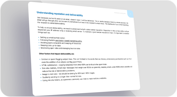 marcloudconsulting.com 10 Understanding reputation and deliverability Just because you’ve hit send on an email, doesn’t mean it will be delivered. This is mainly because there is a whole process the email will go through after you’ve sent it and before it arrives in the recipient’s email inbox. The likelihood of your email reaching the recipient is called deliverability. To help us ensure deliverability, we need to understand what’s called sender reputation. Reputation in this context refers to how respected your IP address is by a receiving email server. To maintain a good sender reputation intact, it’s important to monitor things such as: • Setting up email authentication • Following Pardot’s permission-based marketing policy • Avoiding spam complaints and keeping off blocklists • Keeping Lists up-to-date • Monitoring open rates and managing bounce rates Other factors that impact deliverability are: • Unclear or spam-flagging subject lines. This isn’t limited to the words that we choose, unnecessary punctuation such as !!! or even the addition of an ellipsis can flag spam filters. • HTML optimisation - copying templates from other ESPs can land us in the spam folder. • Size also matters, Gmail clips messages that weigh over 102kb so generally, keeping emails under 80KB where possible will reduce the risk of deliverability problems. • Image to text ratio - we should be aiming for 60% text / 40% images. • Suddenly sending to a larger than normal list size. • Using link shorteners, as spammers commonly use them to mask malicious websites.