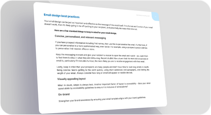 marcloudconsulting.com 15 Email design best practices Your email design can be just as important and effective as the message of the email itself. If the format and function of your email doesn’t work, then it’s likely going to be off-putting to your recipient, and potentially decrease their interest. Here are a few standard things to keep in mind for your email design. Concise, personalised, and relevant messaging If you have prospect information including first names, then use this to personalise the email. Furthermore, if you can personalise in a more sophisticated way, even better. For example, using a prospect’s postal address to personalise their nearest office or store. Keep the messaging relevant and give your recipient a reason to open the email and read it - you want them to feel there is value in what they are consuming. Recent studies have shown that the more conversational an email is, particularly if it includes humour, the more likely you are to receive engagement with that email. Lastly, keep in mind that your prospects are busy people and don’t have time to read long emails in-depth. Being concise means getting to the point quickly, using short sentences and paragraphs, and limiting the length of your email. Always consider how long an email will appear on mobile devices. Visually appealing layout When in doubt, simple is always best. Another important factor of layout is accessibility - does your email layout abide by accessibility guidelines to ensure it is inclusive of all recipients? On-brand Strengthen your brand awareness by ensuring your email template aligns with your brand guidelines.