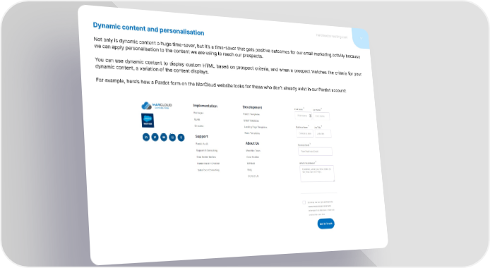 marcloudconsulting.com 17 Dynamic content and personalisation Not only is dynamic content a huge time-saver, but it’s a time-saver that gets positive outcomes for our email marketing activity because we can apply personalisation to the content we are using to reach our prospects. You can use dynamic content to display custom HTML based on prospect criteria, and when a prospect matches the criteria for your dynamic content, a variation of the content displays. For example, here’s how a Pardot form on the MarCloud website looks for those who don’t already exist in our Pardot account: