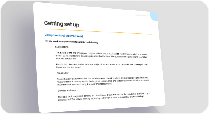 marcloudconsulting.com 11 Getting set up Components of an email send For any email send, you’ll need to consider the following: Subject line This is one of the first things your recipient will see and is the ‘hook’ to enticing your recipient to open the email - so it’s important to give adequate consideration here! We recommend being explicit and descriptive with your subject line. Keep it short because studies show that subject lines with as few as 16 characters have higher open rates than those that are longer! Preheader The preheader is a summary line that usually appears below the subject line in a recipient’s email inbox view. The preheader is typically kept to the length of one sentence long and our recommendation is to simply use the first line of your email body, to appear the most authentic. Sender address The email address you are sending your email from. Should this be from the brand or an individual at your organisation? The answer will vary depending on the type of email you’re sending and your strategy.