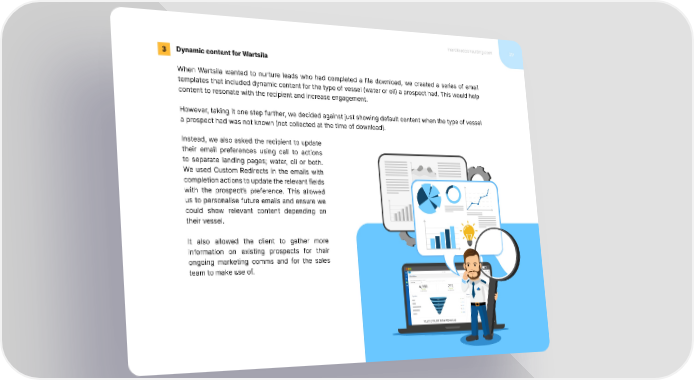 marcloudconsulting.com 29 3 Dynamic content for Wartsila When Wartsila wanted to nurture leads who had completed a file download, we created a series of email templates that included dynamic content for the type of vessel (water or oil) a prospect had. This would help content to resonate with the recipient and increase engagement. However, taking it one step further, we decided against just showing default content when the type of vessel a prospect had was not known (not collected at the time of download). Instead, we also asked the recipient to update their email preferences using call to actions to separate landing pages; water, oil or both. We used Custom Redirects in the emails with completion actions to update the relevant fields with the prospect’s preference. This allowed us to personalise future emails and ensure we could show relevant content depending on their vessel. It also allowed the client to gather more information on existing prospects for their ongoing marketing comms and for the sales team to make use of.