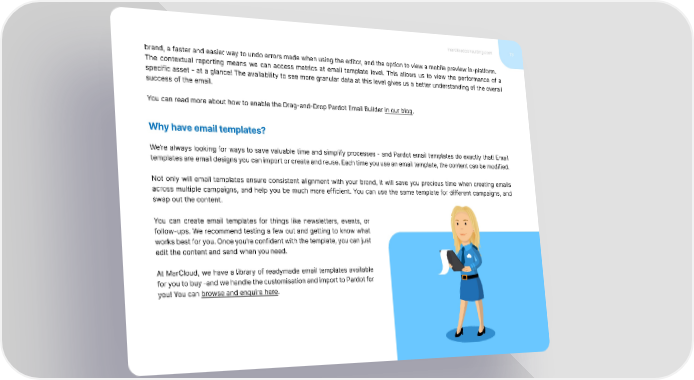 marcloudconsulting.com 13 brand, a faster and easier way to undo errors made when using the editor, and the option to view a mobile preview in-platform. The contextual reporting means we can access metrics at email template level. This allows us to view the performance of a specific asset - at a glance! The availability to see more granular data at this level gives us a better understanding of the overall success of the email. You can read more about how to enable the Drag-and-Drop Pardot Email Builder in our blog. Why have email templates? We’re always looking for ways to save valuable time and simplify processes - and Pardot email templates do exactly that! Email templates are email designs you can import or create and reuse. Each time you use an email template, the content can be modified. Not only will email templates ensure consistent alignment with your brand, it will save you precious time when creating emails across multiple campaigns, and help you be much more efficient. You can use the same template for different campaigns, and swap out the content. You can create email templates for things like newsletters, events, or follow-ups. We recommend testing a few out and getting to know what works best for you. Once you’re confident with the template, you can just edit the content and send when you need. At MarCloud, we have a library of readymade email templates available for you to buy -and we handle the customisation and import to Pardot for you! You can browse and enquire here.